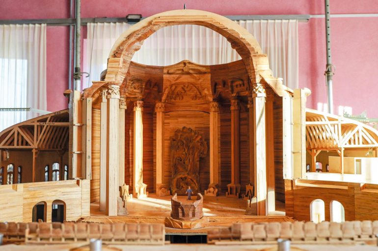 Für das Modell des Ersten Goetheanum ist der Südsaal der Schreinerei nun fertiggestellt. Seit 1994 arbeitete Rudolf Feuerstack an der detailgetreuen Nachbildung im Maßstab 1:20. Schautafeln erklären die Entstehungsgeschichte des Baus. Eine interne kleine Eröffnungsfeier auf Einladung ist für den 13. Mai geplant. Titelbild: Ein Teil des Modells des Ersten...